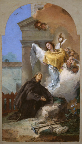 Many miracles are attributed to Saint Paschal, including creating fresh-flowing streams by striking the ground, healing, and miraculous charity. Saint Paschal also experienced mystical visions. On one such occasion, while he was out in the fields with his sheep and unable to go to Mass at the nearby monastery, Paschal was waiting for the sound of the Consecration Bell which he always observed in prayer. In his longing to be present at the Holy sacrifice of the Mass, he cried out, “My Master, My adorable Master, Oh that I might see Thee!” Suddenly before him he saw Angels bowed down before a Chalice, with the Blessed Sacrament floating above it. In the Divine Presence of Our Lord, Paschal fell flat on his face and adored God. Then taking courage he gazed upon the beautiful vision.