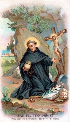 Saint Philip Benizi was born in Florence on the Feast of the Assumption, 1233 of a noble family. That same day the Order of Servites was founded by the Mother of God. As an infant one year old, Philip spoke when in the presence of these new religious and announced the Servants of the Virgin. Amid all the temptations of his youth, he longed to become a Servant of Mary and it was only the fear of his own unworthiness which made him yield to his father’s wish and begin to study medicine. He received the bonnet of a doctor of medicine at Padua.