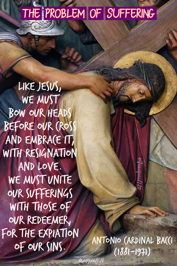 “Christianity, alone, offers an adequate explanation of the mystery of suffering. Why is there such a thing as suffering? The problem is a profound one and the explanations suggested by various schools of philosophy, fail to satisfy the human heart and leave the mind in doubt. Christian doctrine tells us, that God is infinitely good but also infinitely just. Being infinitely good, He created man without suffering. He also gave man the wonderful gift of liberty, which man abused by committing sin. Once the sin had been committed, God, in His infinite justice, demanded expiation. Hence, suffering and death … “and through sin, death and thus death has passed unto all men because all have sinned” (Rom 5:12). Together with death, came the never-ending series of misfortunes, of physical and moral sufferings, which beset humanity.