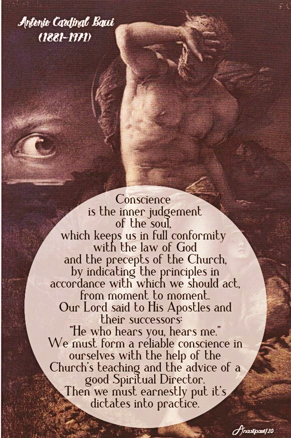 “Conscience is the inner judgement of the soul, which keeps us in full conformity with the law of God and the precepts of the Church, by indicating the principles in accordance with which we should act, from moment to moment.