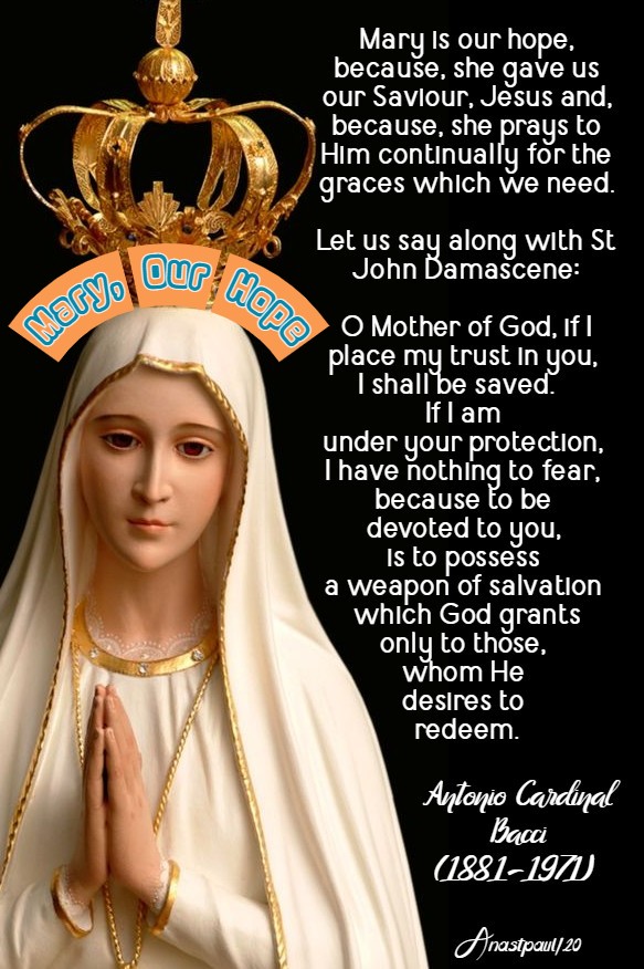 Let us say along with St John Damascene:  “O Mother of God, if I place my trust in you, I shall be saved.   If I am under your protection, I have nothing to fear, because to be devoted to you, is to possess a weapon of salvation which God grants only to those, whom He desires to redeem” (Serm de Nat, cap 4).