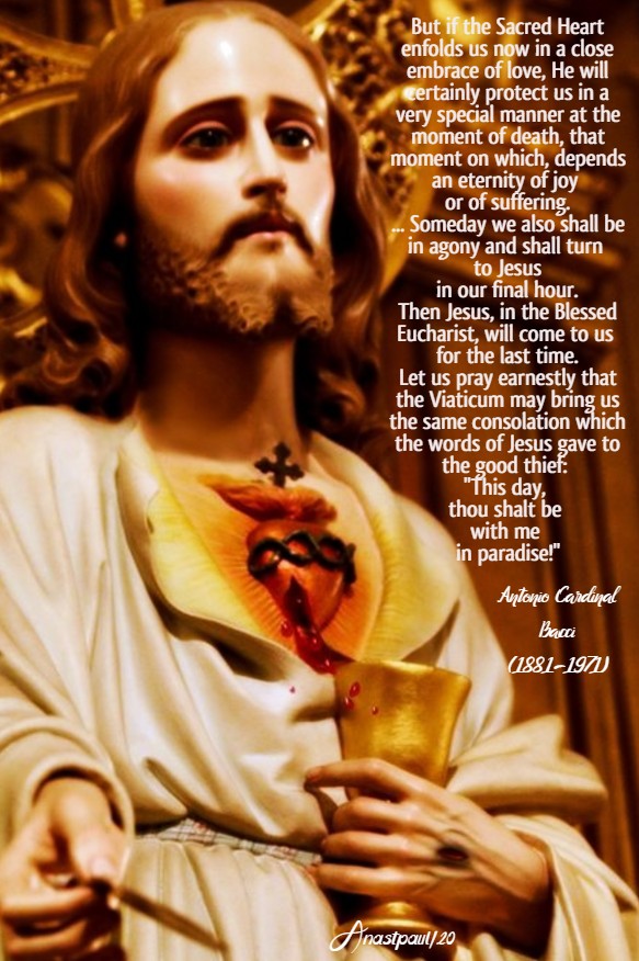 But if the Sacred Heart enfolds us now in a close embrace of love, He will certainly protect us in a very special manner at the moment of death, that moment on which, depends an eternity of joy or of suffering.