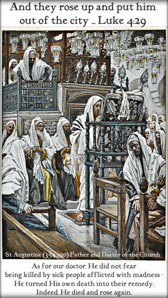 It often happens that mentally ill people end up by beating their doctor. When that happens, the unfortunate doctor is not only not distressed by the one who beat him but attempts to treat him… As for our doctor, He did not fear being killed by sick people afflicted with madness, He turned His own death into their remedy. Indeed, He died and rose again.”…St Augustine (354-430) Father and Doctor of the Church