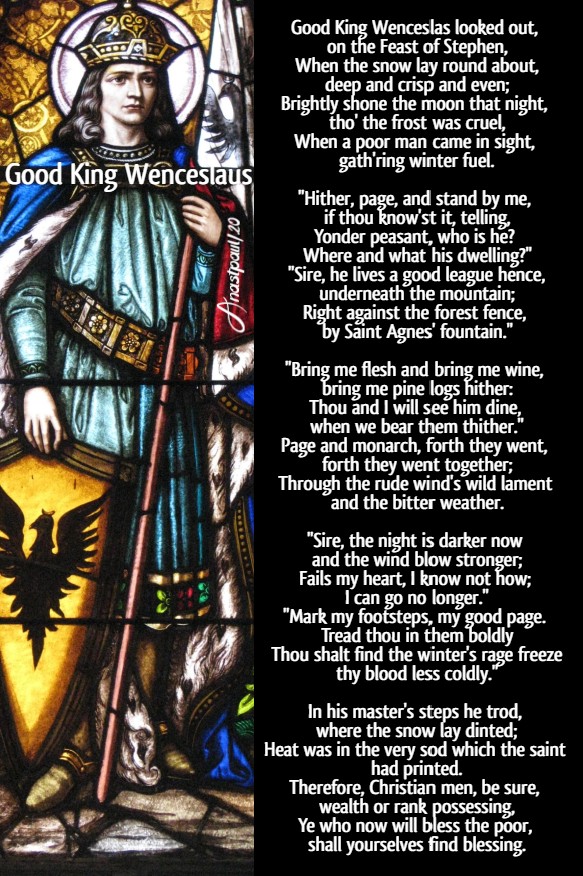 Good King Wenceslas looked out, on the Feast of Stephen, When the snow lay round about, deep and crisp and even; Brightly shone the moon that night, tho’ the frost was cruel, When a poor man came in sight, gath’ring winter fuel.