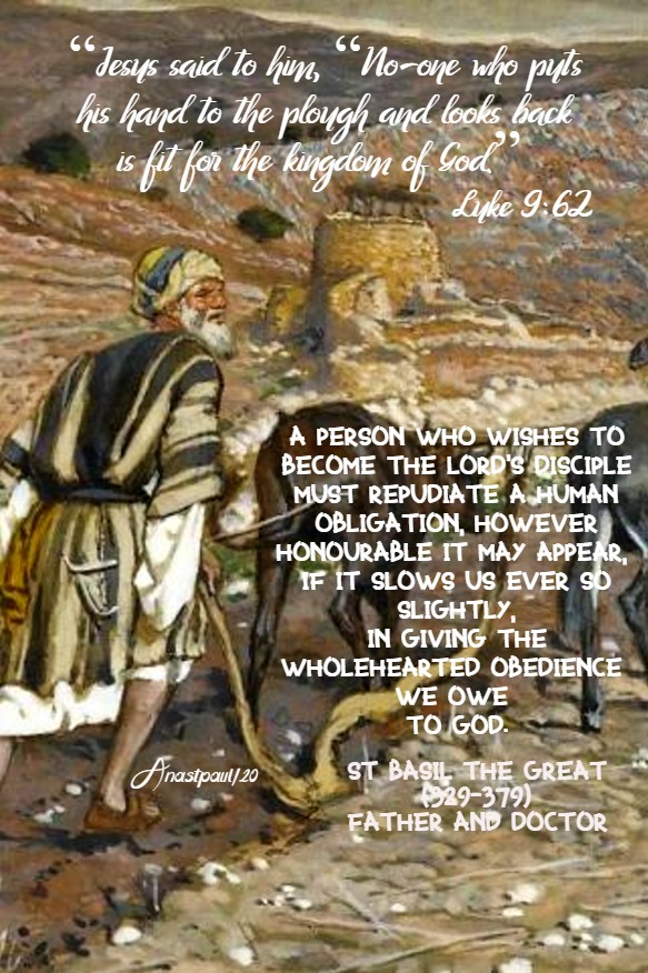 REFLECTION – “The man said, “Allow me first to go and bury my father.” The Lord replied, “Let the dead bury their dead but go and preach the kingdom of God.” Another man said, “Let me first arrange my affairs at home.” He rebuked him with a stern threat, saying, “No man, putting his hand to the plough and looking back, is fit for the kingdom of God.” A person who wishes to become the Lord’s disciple must repudiate a human obligation, however honourable it may appear, if it slows us, ever so slightly, in giving the wholehearted obedience we owe to God.” … St Basil the Great (329-379) – Concerning Baptism