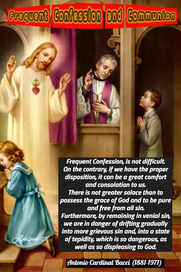 “Among the efficacious means of self-sanctification, are frequent Confession and Holy Communion. Confession purifies the soul of sin, into which, unfortunately, we continue to fall and confers sacramental grace, through which we are fortified against the assaults of the devil. It also gives us an opportunity of being guided on the right road by our Confessor, who knows our secret failings and will give us, in God’s name, words of encouragement, comfort and spiritual direction. We should frequently receive this Sacrament of God’s mercy – in fact, those who are striving after holiness, should go to Confession every week, or, at least every fortnight. Even if we have not committed grave sin, when we examine ourselves before God, we shall find many faults and failings. The Holy Spirit reminds us that, even the just man sins seven times a day, which means many times. “The just man falls seven times” (Prov 24:16). “If we say that we have no sin” writes St John, “we deceive ourselves and the truth is not in us” (1 Jn 1:8). Since then, we are all poor sinners and Jesus, in His infinite goodness has given us this means of purifying our souls, we should not neglect to use it to remain in the state of grace. Frequent Confession, is not difficult. On the contrary, if we have the proper disposition, it can be a great comfort and consolation to us. There is not greater solace than to possess the grace of God and to be pure and free from all sin. Furthermore, by remaining in venial sin, we are in danger of drifting gradually into more grievous sin and, into a state of tepidity, which is so dangerous, as well as so displeasing to God.”