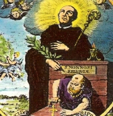 Nonnosus is mentioned in a 12th-century collection of legends from Carinthia, Austria. His cult spread to Bavaria, where relics are kept in the crypt of Freising Cathedral. Veneration of Nonnosus was also established at Monte Soratte in the 1650s, due to the efforts of Andrea di San Bonaventura, a Cistercian Monk and in 1661 some of his relics returned to Monte Soratte and Nonnosus’ cult spread across central Italy.