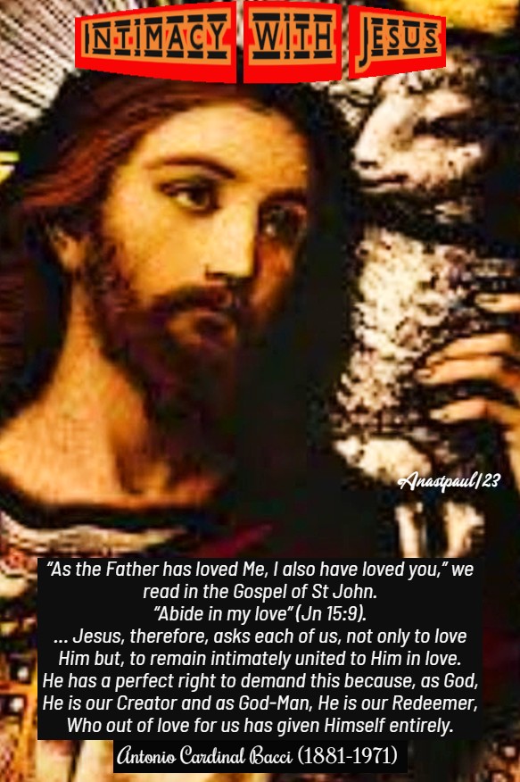 Jesus, therefore, asks each of us, not only to love Him but, to remain intimately united to Him in love. He has a perfect right to demand this because, as God, He is our Creator and as God-Man, He is our Redeemer, Who ,out of love for us has given Himself entirely.”