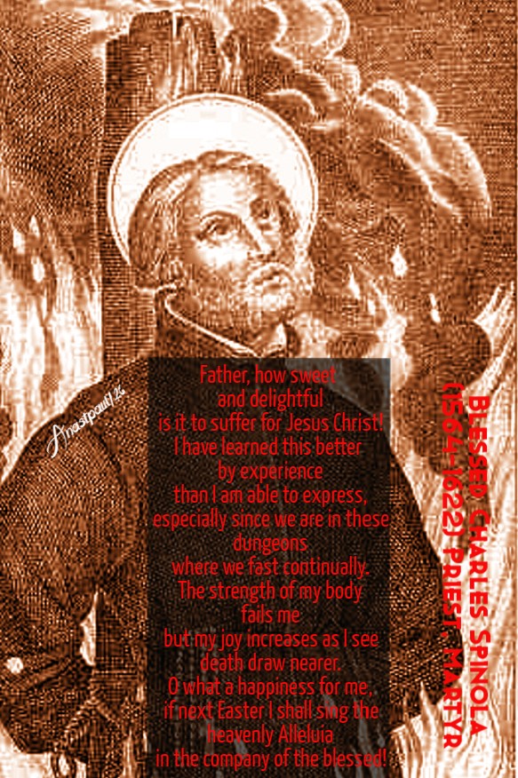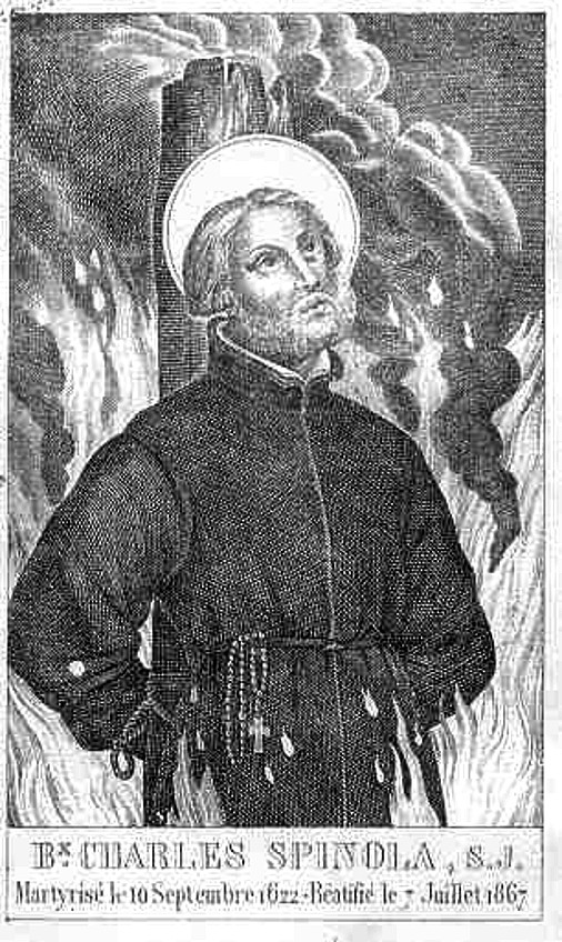 Charles Spinola was born in Madrid, Spain. His father, the Italian Count of Tassarolo, was tutor to Prince Rudolph, the Emperor’s son. After his early studies in Spain, Charles was sent to the Jesuit school in Nola, Italy where he lived with his uncle Philip Spinola, the Bishop of Nola. As a youth, Charles was so moved by the Martyrdom in India of Rudolph Acquaviva’s heroic example of love for God, that he too was determined to die for Christ and the faith. He entered the Society and became a novice at the Nola novitiate. In 1584 he went to Naples for his philosophy and after taking his vows, he was sent to Brera College in Milan where he completed his philosophy and his theology studies, though at the time his health was not too good. After his Ordination in 1594, he was assigned to give parish missions in Cremona although he had requested to go on foreign missions.