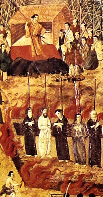 When fastened to his stake, Fr Spinola intoned the psalm, Praise the Lord, All You Nations and the martyrs joined in a song of thanksgiving to God. The fires were lit but the wood was so arranged to prolong the victims’ suffering. Fr Spinola died within half an hour as he was greatly weakened after four years of imprisonment. Fr Kimura, endured his martyrdom for three hours and was the last to die, during which time he remained immobile with his arms outstretched in the form of a cross.