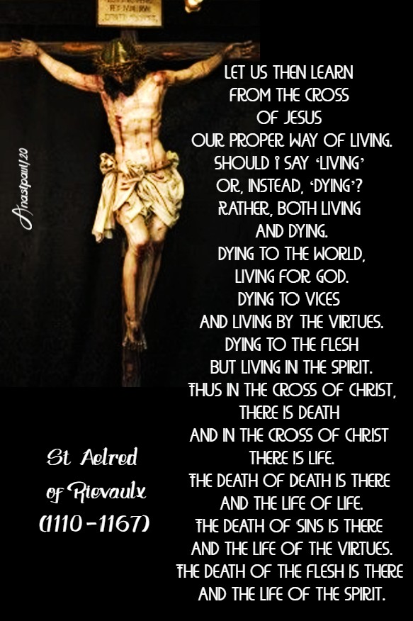 “Let us then learn from the Cross of Jesus our proper way of living. Should I say ‘living’ or, instead, ‘dying’? Rather, both living and dying. Dying to the world, living for God. Dying to vices and living by the virtues. Dying to the flesh, but living in the spirit. Thus in the Cross of Christ, there is death and in the Cross of Christ there is life. The death of death is there and the life of life. The death of sins is there and the life of the virtues. The death of the flesh is there and the life of the spirit.”