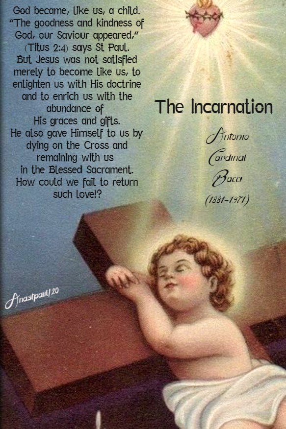 We can see, furthermore, another explanation of the great mystery of the Incarnation. God infinitely loved man, who was the work of His omnipotence. Precisely because He loved him, He wished to be loved by him in return. But because the spirit of man is united to matter, he does not see God, except through the works of His creation. He sees Him, as it were, “through a mirror in an obscure manner,” (1 Cor 13:12) and not face-to-face. He does not love God, therefore, as he would if he could see Him in all His beauty. He would need to see Him and to know Him better, before he could love Him more. So God made Himself small by becoming man. “Human wisdom often asks,” writes Bossuet, “why God came on earth.” To this I reply: “He came to be lobed by men.“ “God was great,” writes St Bernard, “so great as to demand to be adored. Now He has become small, so that He may be better loved.” God became, like us, a child. “The goodness and kindness of God, our Saviour appeared,” (Titus 2:4) says St Paul. But Jesus was not satisfied merely to become like us, to enlighten us with His doctrine and to enrich us with the abundance of His graces and gifts. He also gave Himself to us by dying on the Cross and remaining with us in the Blessed Sacrament. How could we fail to return such love!?“