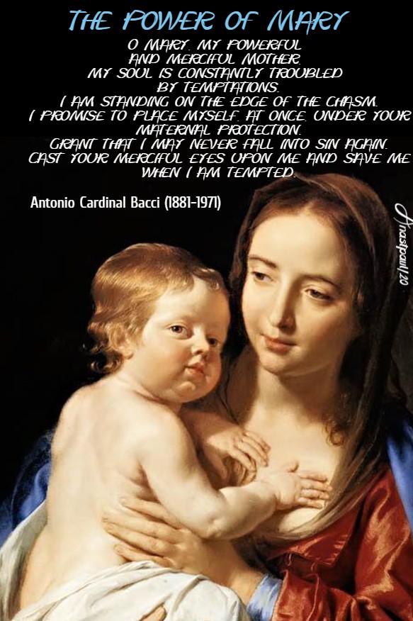 “O Mary, my powerful and merciful Mother, my soul is constantly troubled by temptations. I am standing on the edge of the chasm. I promise to place myself, at once, under your maternal protection. Grant that I may never fall into sin again. Cast your merciful eyes upon me and save me when I am tempted. Grant that temptations may never again endanger the purity of my soul, by obtaining for me from God, a lively spirit of faith, a burning love fo Him and for you, a constant watchfulness over my senses and over worldly dangers and the gift of fervent and persevering prayer, in union with you and your divine Son, Jesus, Amen.”