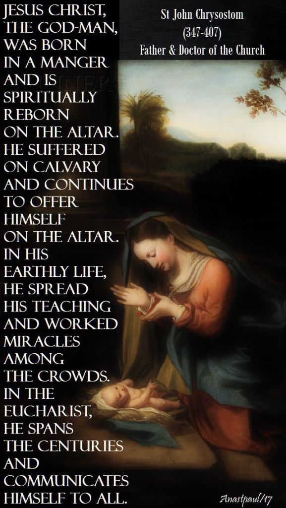 “Jesus Christ, the God-Man, was born in a manger and is spiritually reborn on the altar. He suffered on Calvary and continues to offer Himself on the altar. In His earthly life, He spread His teaching and worked miracles among the crowds. In the Eucharist, He spans the centuries and communicates Himself to all.”