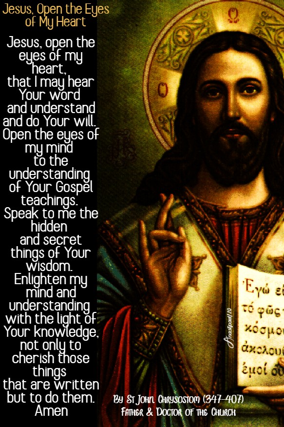 “Jesus, open the eyes of my heart, that I may hear Your word and understand and do Your will. Open the eyes of my mind to the understanding of Your Gospel teachings. Speak to me the hidden and secret things of Your wisdom. Enlighten my mind and understanding with the light of Your knowledge, not only to cherish those things that are written but to do them. Amen”