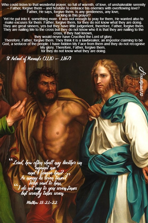 REFLECTION – “The perfection of brotherly love lies in the love of one’s enemies. We can find no greater inspiration for this, than grateful remembrance of the wonderful patience of Christ. He who is more fair than all the sons of men, offered His fair face to be spat upon by sinful men. He allowed those eyes, that rule the universe, to be blindfolded by wicked men. He bared His back to the scourges. He submitted that head which strikes terror in principalities and powers, to the sharpness of the thorns. He gave Himself up to be mocked and reviled and, at the end, endured the cross, the nails, the lance, the gall, the vinegar, remaining always gentle, meek and full of peace. In short, He was led like a sheep to the slaughter and like a lamb before the shearers He kept silent and did not open his mouth. Who could listen to that wonderful prayer, so full of warmth, of love, of unshakeable serenity – Father, forgive them – and hesitate to embrace his enemies with overflowing love? Father, He says, forgive them. Is any gentleness, any love, lacking in this prayer? Yet He put into it, something more. It was not enough to pray for them, He wanted also to make excuses for them. Father, forgive them, for they do not know what they are doing. They are great sinners, yes but they have little judgement, therefore, Father, forgive them. They are nailing Me to the cross but they do not know who It is that they are nailing to the cross, if they had known, they would never have Crucified the Lord of glory. Therefore, Father, forgive them. They think it is a lawbreaker, an impostor claiming to be God, a seducer of the people. I have hidden My Face from them and they do not recognise My glory. Therefore, Father, forgive them, for they do not know what they are doing.
