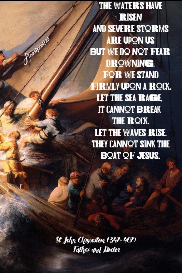 “The waters have risen and severe storms are upon us but we do not fear drowning, for we stand firmly upon a rock. Let the sea rage, it cannot break the rock. Let the waves rise, they cannot sink the boat of Jesus.”