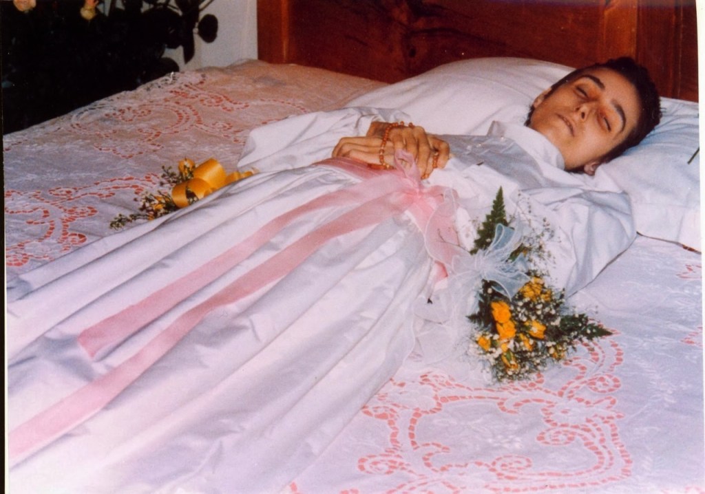 When Chiara realised she was not going to get better, she started to plan for her “wedding” (her funeral) with her mother. She chose the music, songs, flowers and the readings for Mass. She wanted to be buried in her “wedding dress” a white dress with a pink waist, because her death would allow her to become the bride of Christ. She told her mother, “When you’re getting me ready, Mum, you have to keep saying to yourself, ‘Chiara Luce is now seeing Jesus.’“