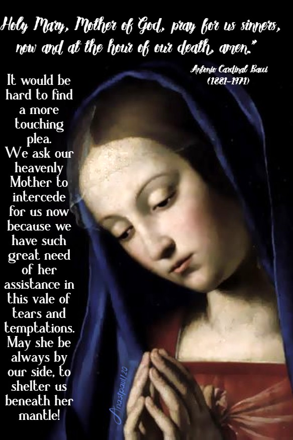 In the first part of the Hail Mary, then, we pay her the words of the Gospel, the highest tributes ever accorded to any human creature, proclaiming her to be full of grace, blessed among women and Mother of the Redeemer. The second part, which was later added by the Church, is a heartfelt supplication addressed to Mary as the Mother of God and our Mother. “Holy Mary, Mother of God, pray for us sinners, now and at the hour of our death, amen.” It would be hard to find a more touching plea. We ask our heavenly Mother to intercede for us now because we have such great need of her assistance in this vale of tears and temptations. May she be always by our side, to shelter us beneath her mantle!”