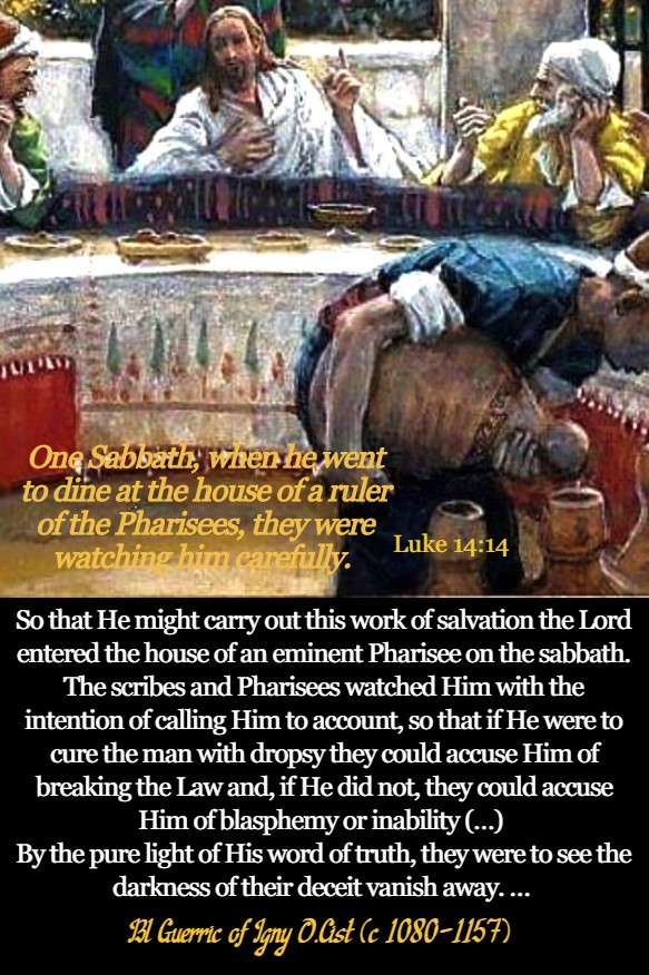 So that He might carry out this work of salvation the Lord entered the house of an eminent Pharisee on the sabbath. The scribes and Pharisees watched Him with the intention of calling Him to account, so that if He were to cure the man with dropsy they could accuse Him of breaking the Law and, if He did not, they could accuse Him of blasphemy or inability (…) By the pure light of His word of truth, they were to see the darkness of their deceit vanish away. … Blessed Guerric of Igny O.Cist (c 1080-1157) – Cistercian Abbot (Liturgical sermons).