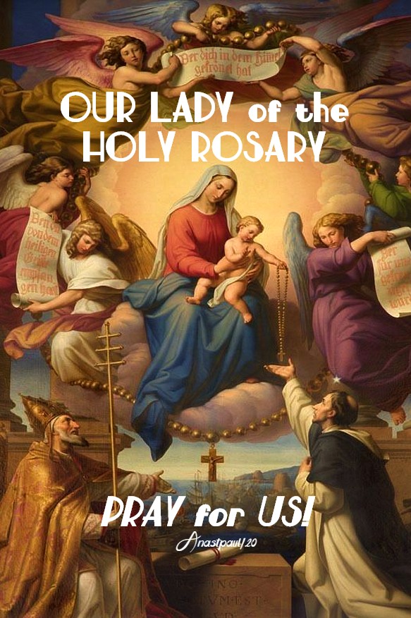 PRAYER – Lord Jesus, help us to appreciate and live Your spiritual values and give them the first place in our hearts. Grant that we may always seek them first and remain forever united with You. Send Your Spirit with his gifts and blessings and may the Mother of all Virtue, assist us in our need. Help us to follow the path of humility the Blessed Virgin so splendidly taught us and may we always beseech Our Lady of the Holy Rosary for her intercession, that we may obtain from You, a place in Your Kingdom. Our Lady of the Holy Rosary, pray for us. We make our prayer through Christ our Lord, in the unity of the Holy Spirit, God now and for all times, amen.