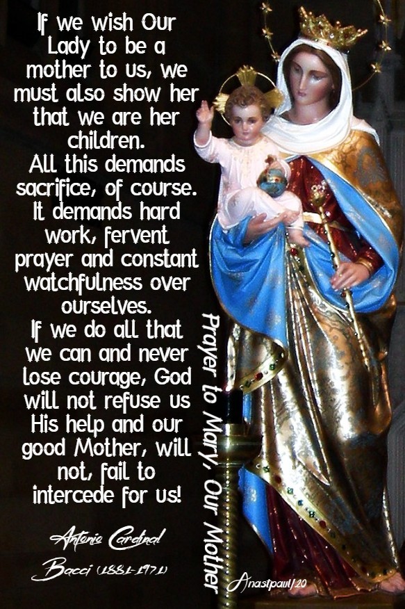If we wish Our Lady to be a mother to us, we must also show her that we are her children. Earthly mothers are delighted to think that their offspring take after them. In the same way, Mary wishes to see, a reflection of her own sanctity in our thoughts, desires and actions. All this demands sacrifice, of course. It demands hard work, fervent prayer and constant watchfulness over ourselves. If we do all that we can and never lose courage, God will not refuse us His help and our good Mother, will not, fail to intercede for us!”