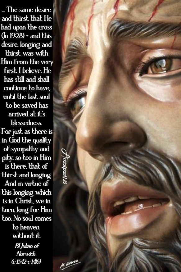 REFLECTION – “Thus shall the spiritual thirst of Christ be quenched. This is His thirst – His love and longing for us that goes on enduring until we see the Day of Judgement. For of us who are to be saved and be Christ’s joy and bliss, some are alive now, while others- are ‘yet unborn and so, it will go on until that Day. His thirst and loving longing, is to have us all, integrated in Himself, to His great enjoyment. At least, so I see it (…) Because He is God, He is ‘supreme blessedness and never has been nor ever shall be other. His eternal blessedness can neither be increased nor diminished (…) Because He is human – this too is known by the creed and by the revelations – it was shown, that He, though God, suffered pain, passion, and death, for love of us and to bring us to blessedness (…) Since Christ is our Head, He must be both glorious and impassable. But since He is also the Body, in which all His members are joined (Eph 1:23), He is not yet fully either of these. Therefore, the same desire and thirst that He had upon the cross (Jn 19:28) – and this desire, longing and thirst was with Him from the very first, I believe He has still and shall continue to have, until the last soul to be saved has arrived at it’s blessedness. For just as there is in God the quality of sympathy and pity, so too in Him is there, that of thirst and longing. And in virtue of this longing which is in Christ, we in turn, long for Him too. No soul comes to heaven without it. This quality of longing and thirst springs from God’s eternal goodness just as pity does (…) and, this thirst will persist in Him, as long as we are in need, drawing us up, to His blessedness.” – Blessed Julian of Norwich (c 1342-c 1416) (aged 73–74) Anchorite, Mystic (Revelations of divine love, ch. 31)