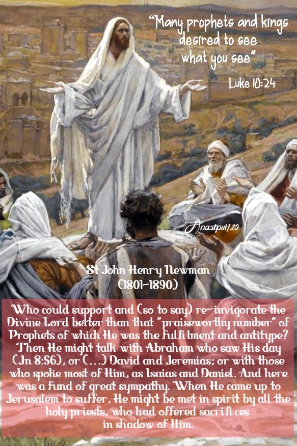 REFLECTION – “From the time of His birth we may suppose He held communion with the spirits of the Old Fathers, who had prepared His coming and prophesied of it. On one occasion He was seen all through the night, conversing with Moses and Elias, and that conversation was about His Passion. What a field of thought is thus opened to us, of which we know how little. When He passed whole nights in prayer (…) Who could support and (so to say) re-invigorate the Divine Lord better than that “praiseworthy number” of Prophets of which He was the fulfilment and antitype? Then He might talk with Abraham who saw His day (Jn 8:56), or (…) David and Jeremias; or with those who spoke most of Him, as Isaias and Daniel. And here was a fund of great sympathy. When He came up to Jerusalem to suffer, He might be met in spirit by all the holy priests, who had offered sacrifices in shadow of Him.” … St John Henry Newman (1801-1890) Cardinal, founder of the Oratory in England, Theologian – Meditations and Devotions: Part III, 2, 2, “Our Lord refuses sympathy”
