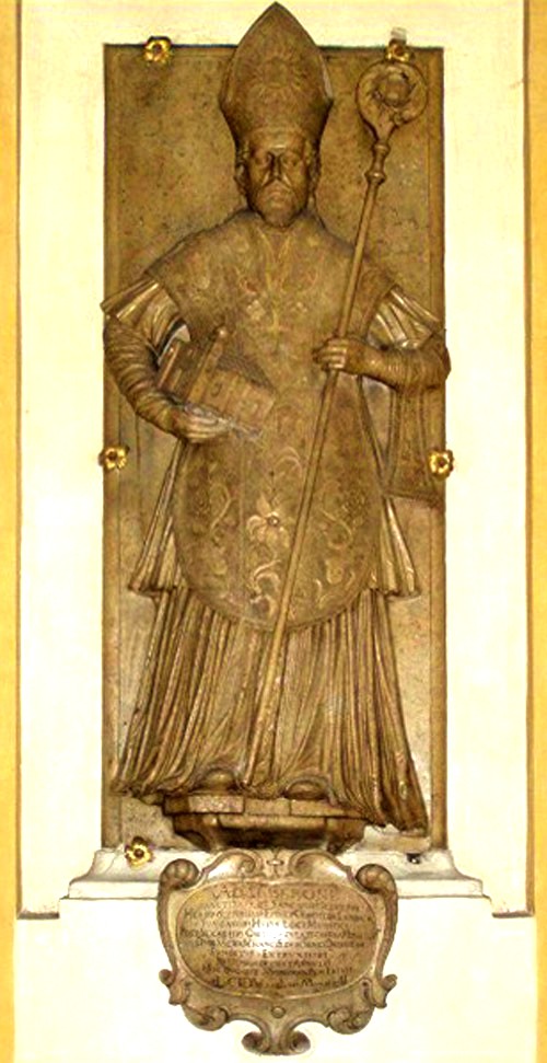 In 1883 Pope Leo confirmed Adalbero’s cult and Beatified him. Since 1948, in the “Neumünsterkirche” in Würzburg there has been a glass shrine, by Josef Amberg, containing a thighbone of Adalbero as a relic. Also in Würzburg is the neo-Romanesque St Adalbero’s Church.