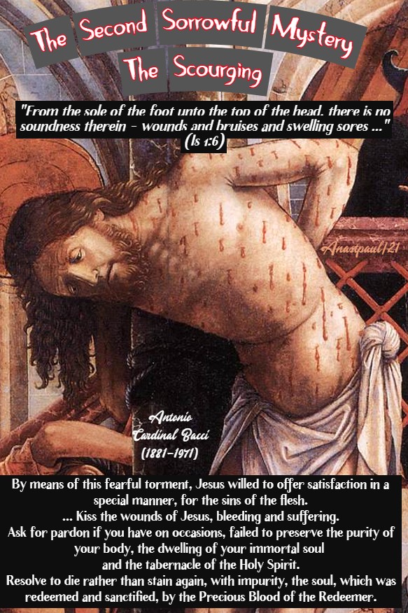 “Think about the manner in which Jesus was scourged. His chaste body, is stripped by the jeering soldiers, His hands are tied and He is bound to a pillar. The soldiers come forward with their whips and begin to beat Him mercilessly. As His Blood flows freely to the ground, Jesus quivers with pain and emits a half-suppressed groan. But fresh blows continue to rain down on His bruised flesh. So the prophecy is fulfilled in which Isaias described the punishment of the chosen people, whose sins and whose chastisement, the divine Redeemer has chosen to take on Himself. “From the sole of the foot unto the top of the head, there is no soundness therein – wounds and bruises and swelling sores …“ (Is 1:6).
