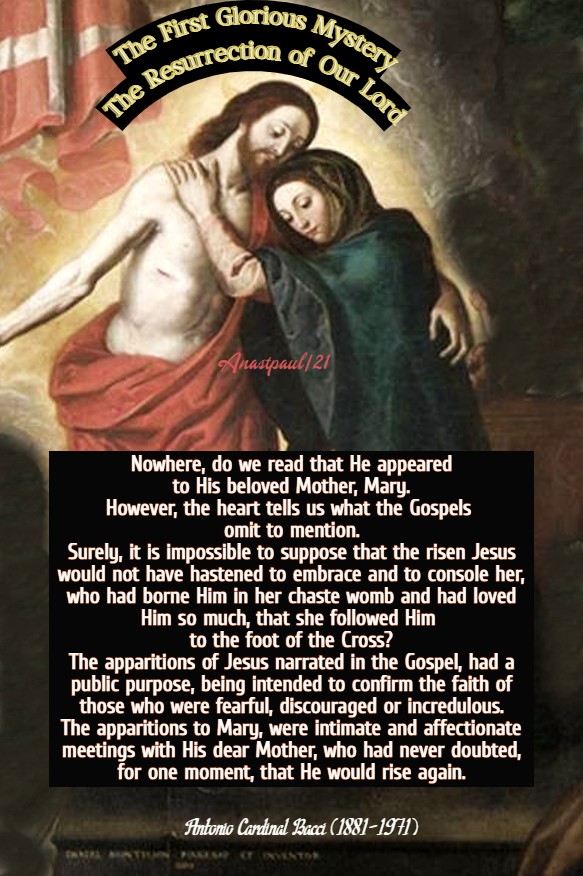 The apparitions to Mary, were intimate and affectionate meetings with His dear Mother, who had never doubted, for one moment, that He would rise again.