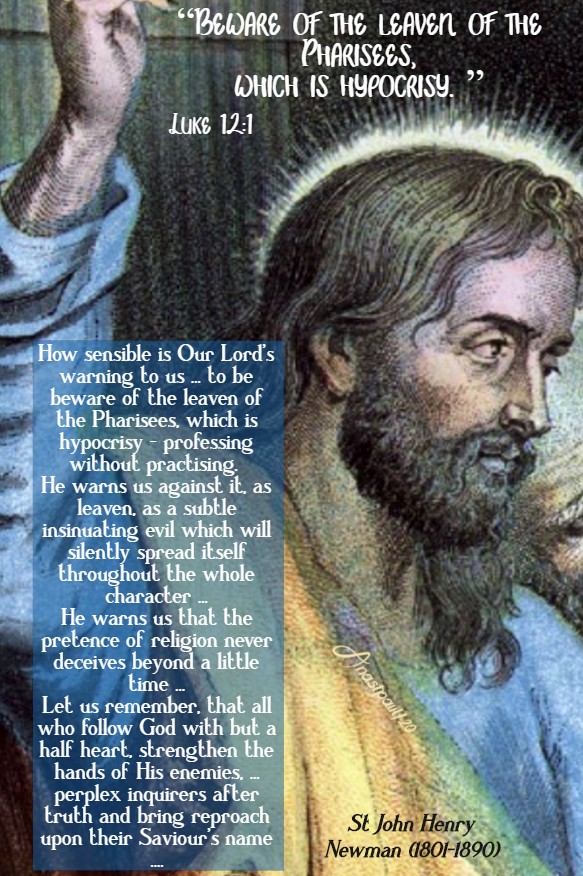 “How sensible is Our Lord’s warning to us … to be beware of the leaven of the Pharisees, which is hypocrisy – professing without practising. He warns us against it, as leaven, as a subtle insinuating evil which will silently spread itself throughout the whole character … He warns us that the pretence of religion never deceives beyond a little time … Let us remember, that all who follow God with but a half heart, strengthen the hands of His enemies, … perplex inquirers after truth and bring reproach upon their Saviour’s name …. Woe unto the deceiver and self-deceived! …. God give us grace to flee from this woe while we still have time! Let us examine ourselves, to see if there be any wicked way in us. … And, let us pray God to enlighten us and to guide us and, to give us the will to please Him and the power.” – St John Henry Newman C.Orat (1801-1890)