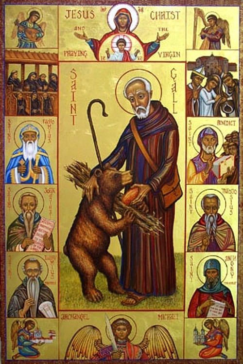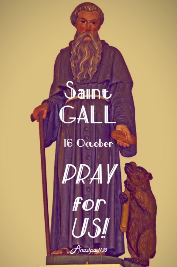 Saint of the Day – 16 October – Saint Gall (c 550–c 646) Monk, Missionary, Hermit – he was a disciple and one of the traditional twelve companions of Saint Columbanus on his mission from Ireland to the continent. He is also known as Callo, Chelleh, Gaaech, Gallen, Gallo, Gallonus, Gallunus, Gallus, Gilianus. Saint Deicolus was the elder brother of Gall. An assiduous preacher of the Gospel, a skilful trainer of people in the work of evangelisation, and a man of remarkable holiness of his life, Saint Gall left an abiding mark on the country in which he worked. His memory has long been revered in the locality of his labours he became known and honoured as the “Apostle of Switzerland.” Patronages – bears, birds, geese, poultry, Sweden, Switzerland, St Gallen and the Diocese of St Gallen, Switzerland.