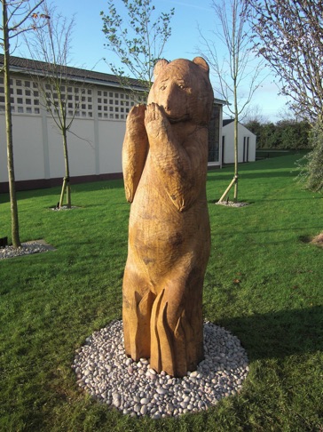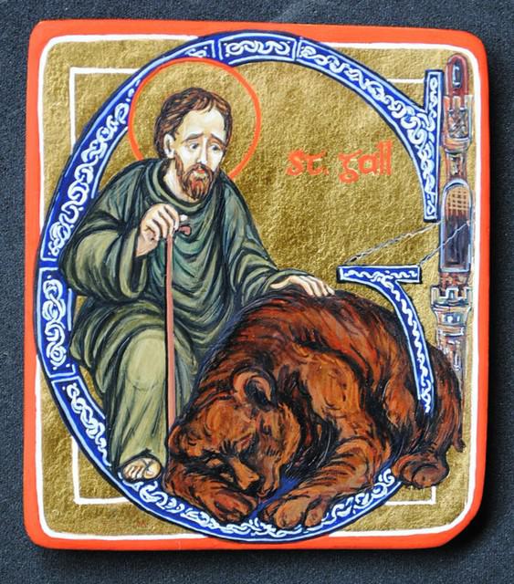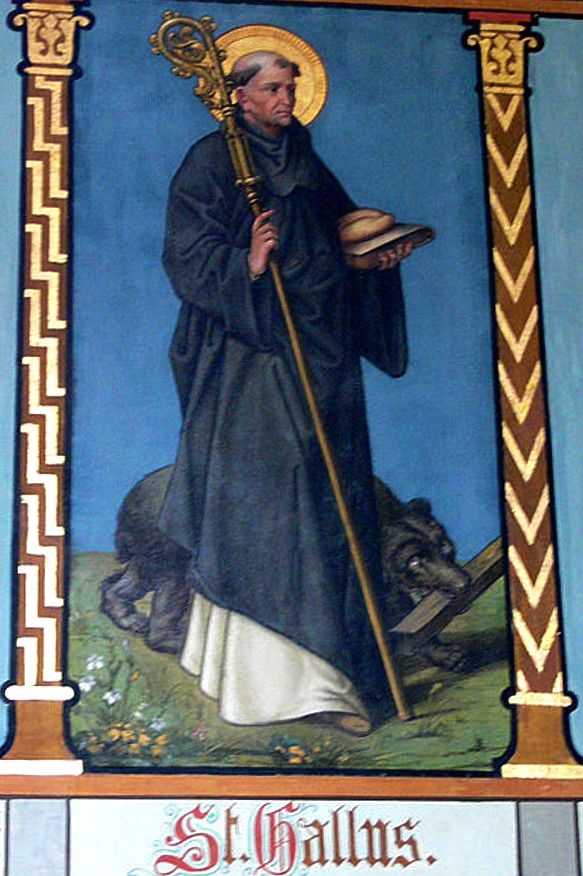 A miracle about Saint Gall in his solitary life has become well-known. The story tells how a bear became St Gall’s sole/soul friend in the closing years of his life and that the bear used to carry logs to the saint so that he could light his fire. The bear has now become the coat of arms for the town of St Gallen in Switzerland and the bear carrying the logs is depicted on the wall of the great Cathedral there.