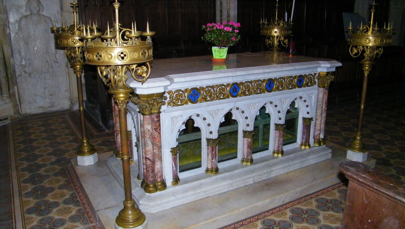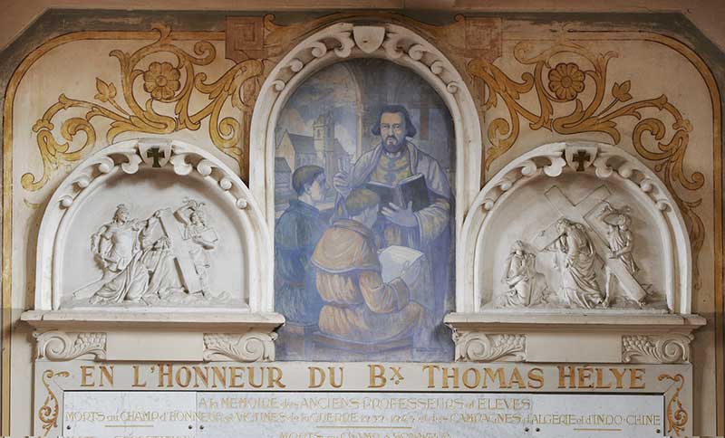 In 1794, his relics were hidden to prevent their destruction during the persecutions of the French Revolution. In 1910 his glass coffin was enclosed in a marble sarcophagus. If you look carefully at the photograph below, you will see a marble slab with a relief of Blessed Thomas. This slab covered the original tomb and has now been reset into the wall. The sarcophagus resides in the choir of the St Peters in Biville where he is venerated by many pilgrims and where many miracles have been reported. During the annual festivals of his feast day, pilgrims come from all over the region.