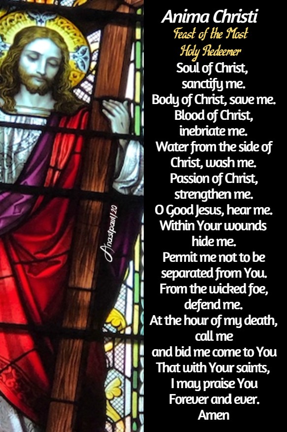 Soul of Christ, sanctify me. Body of Christ, save me. Blood of Christ, inebriate me. Water from the side of Christ, wash me. Passion of Christ, strengthen me. O Good Jesus, hear me. Within Your wounds hide me. Permit me not to be separated from You. From the wicked foe, defend me. At the hour of my death, call me and bid me come to You That with Your saints, I may praise You Forever and ever. Amen