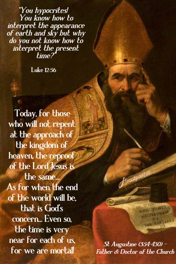REFLECTION – “The gospel tells us that some people were rebuked by the Lord because, clever as they were at reading the face of the sky, they could not recognise the time for faith when the kingdom of heaven was at hand. It was the Jews who received this reprimand but it has also come down to us. The Lord Jesus began His preaching of the gospel with the admonition: “Repent, for the kingdom of heaven is at hand” (Mt 4:17). His forerunner, John the Baptist, began his in the same way: “Repent,” he said, “for the kingdom of heaven is at hand” (Mt 3:2). Today, for those who will not repent at the approach of the kingdom of heaven, the reproof of the Lord Jesus is the same… As for when the end of the world will be, that is God’s concern… Even so, the time is very near for each of us, for we are mortal. There are hazards all around us. We should be in less danger from them were we made of glass. What more fragile than a vessel of glass? And yet it can be kept safe and last indefinitely. Of course it is exposed to accidents but it is not liable to old age and the suffering it brings. We, therefore, are the more frail and infirm. In our weakness we are haunted by fears of all the calamities that regularly befall the human race and if no such calamity overtakes us, still, time marches on. We may evade the blows of fortune but shall we evade death? We may escape perils from without but shall we escape what comes from within us? Now, suddenly, we may be attacked by any malady. And if we are spared? Even so, old age comes at last and nothing will delay it.”… St Augustine (354-430) – Father & Doctor of the Church – Sermon 109