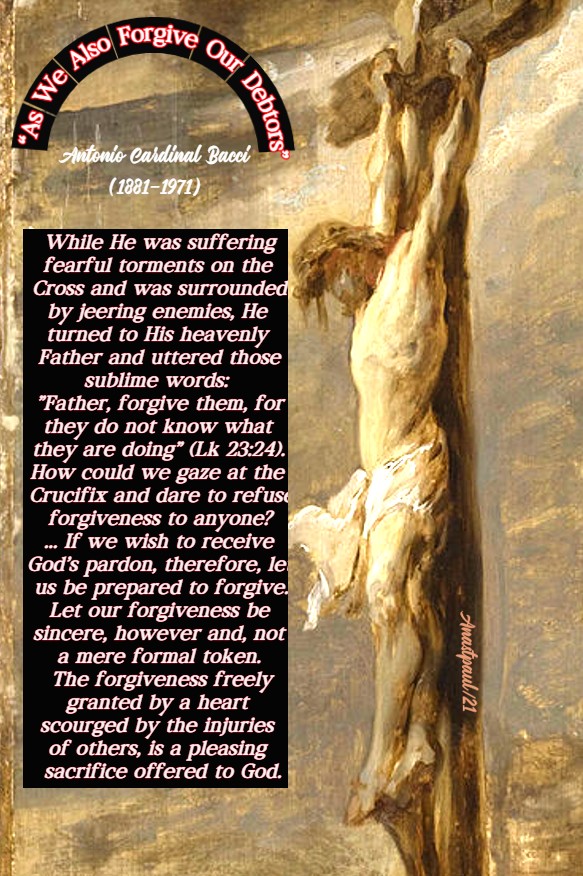 How could we gaze at the Crucifix and dare to refuse forgiveness to anyone? No matter how grave may seem the injuries done to us by our neighbour, let us remember, that they are insignificant in comparison with the insults which we have dared to offer to the infinite majesty of our Creator. They are as the hundred denarii compared with the ten thousand talents of Christ’s parable (Mt 18:24-28).