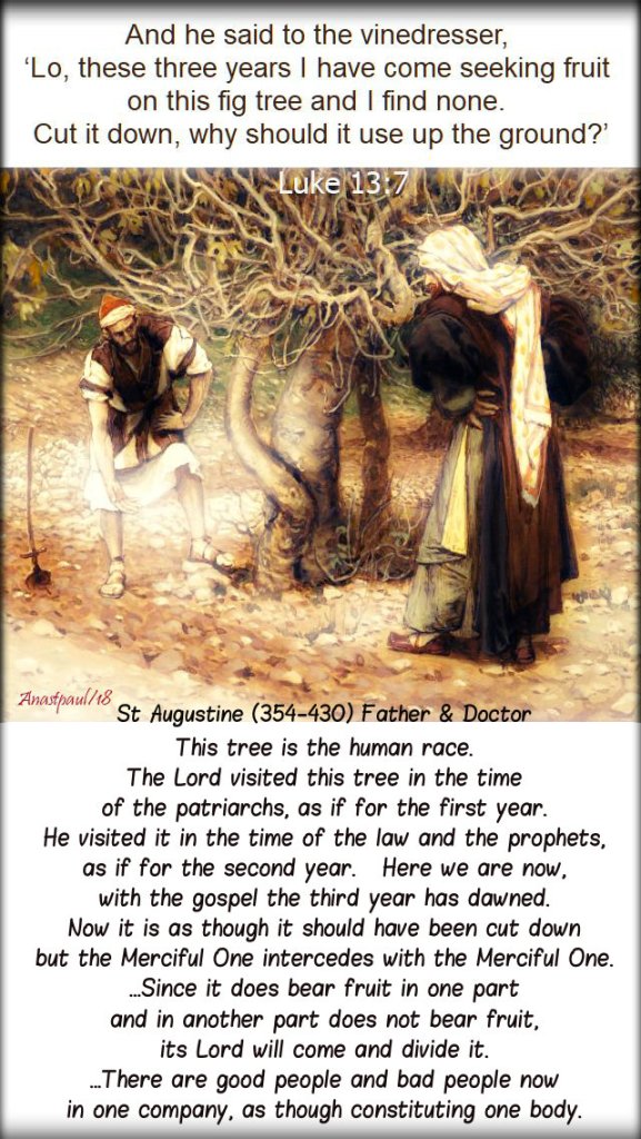 This tree is the human race. The Lord visited this tree in the time of the patriarchs, as if for the first year. He visited it in the time of the law and the prophets, as if for the second year. Here we are now, with the gospel the third year has dawned. Now it is as though it should have been cut down but the merciful one intercedes with the merciful one. He wanted to show how merciful he was and so he stood up to himself with a plea for mercy. “Let us leave it,” he says, “this year too. Let us dig a ditch around it.” Manure is a sign of humility. “Let us apply a load of manure, perhaps it may bear fruit.” Since it does bear fruit in one part and in another part does not bear fruit, it’s Lord will come and divide it. What does that mean, “divide it?” There are good people and bad people now in one company, as though constituting one body.” – St Augustine (354-430)Doctor of Grace – Sermon 254