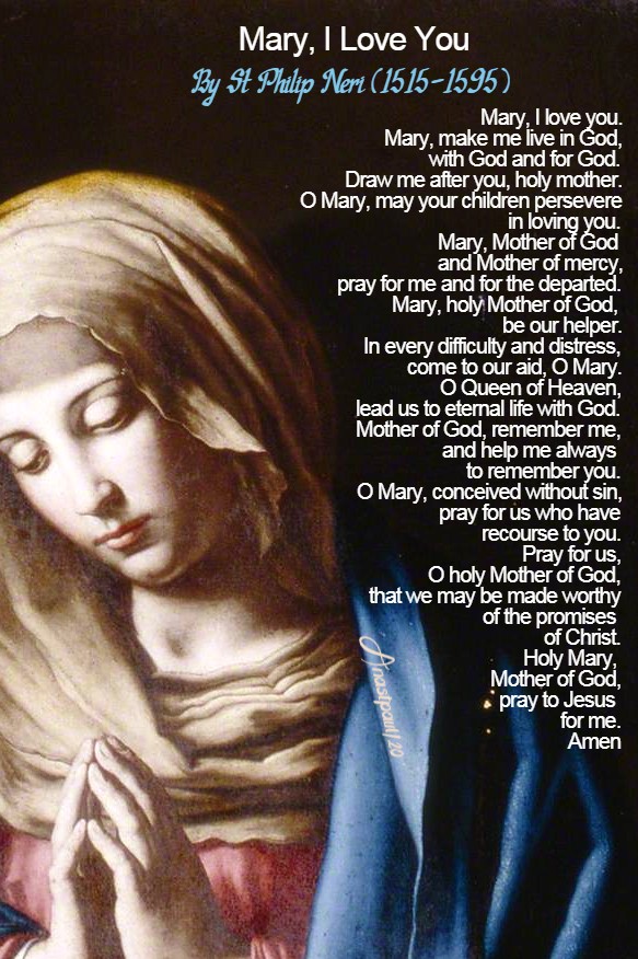 Mary, I love you. Mary, make me live in God, with God and for God. Draw me after you, holy mother. O Mary, may your children persevere in loving you. Mary, Mother of God and Mother of mercy, pray for me and for the departed. Mary, holy Mother of God, be our helper. In every difficulty and distress, come to our aid, O Mary. O Queen of Heaven, lead us to eternal life with God. Mother of God, remember me, and help me always to remember you. O Mary, conceived without sin, pray for us who have recourse to you. Pray for us, O holy Mother of God, that we may be made worthy of the promises of Christ. Holy Mary, Mother of God, pray to Jesus for me. Amen