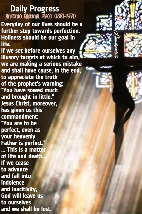 This is a matter of life and death and here we speak of eternal life. If we cease to advance and fall into indolence and inacitivity, God will leave us to ourselves and we shall be lost. A man who is not advancing in the spiritual life must lose ground sooner or later because, he is not obeying the command of Jesus Christ.”