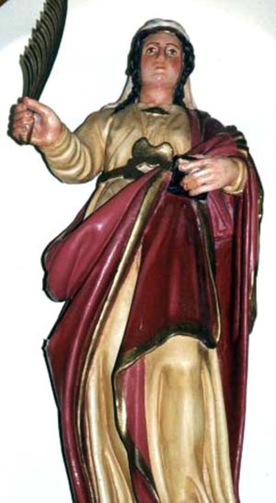 Provoked at these seducing flatteries, our Saint threw down the idol and trampled upon the cake which was laid for the sacrifice. At the judge’s order, two executioners tore her tender sides with iron hooks, so as to leave the very bones bare. Next lighted torches were applied to her breasts and sides; under which torment, instead of groans, nothing was heard from her mouth but thanksgivings. The fire at length catching her hair, surrounded her head and face and the Saint was stifled by the smoke and flame. As she expired a dove flew out of her mouth. This frightened away the soldiers and allowed a miraculous snow to cover her nakedness, its whiteness indicating her purity and Sainthood.