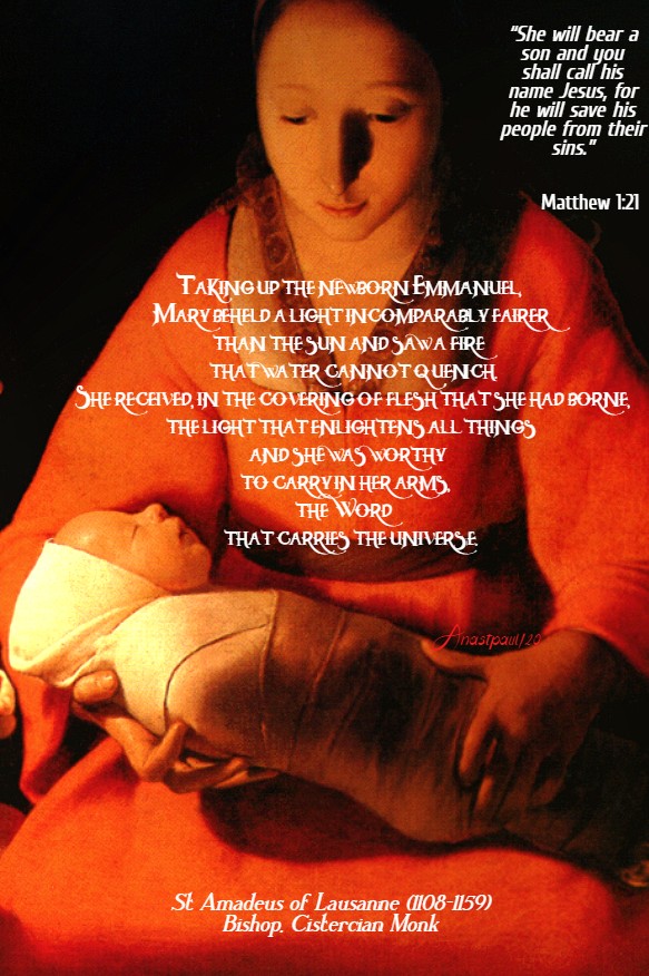 REFLECTION – “The heavens were glad, earth exulted when Mary gave birth and hell was troubled and aghast. The heavens in their joy produced a shining star and a glorious army of angels, uttering praise and saying: “Glory to God in the highest and on earth peace to people of good will.” (Lk 2:14) The earth, exulting, brought shepherds giving glory and magi adoring and offering gifts, gold, frankincense and myrrh. … Reflect how that night poured forth light in the darkness and instead of blackness, it offered radiance. It gave light before the sun arose and a brightness which, from its exceeding brilliance, obscured the splendour of the sun. Concerning this night the psalmist says: “Night is my light in my delights” and turning to the Lord he says: “The darkness will not be dark for you and the night will be as bright as the day, for the darkness is as light for him” (cf Ps 38[139]:11-12 LXX). … Taking up the newborn Emmanuel, Mary beheld a Light incomparably fairer than the sun and saw a Fire that water cannot quench. She received, in the covering of flesh Whom she had borne, the Light Who enlightens all things and she was worthy, to carry in her arms, the Word Who carries the universe!– St Amadeus of Lausanne (1108-1159) Bishop, Cistercian Monk – Homilies in praise of the Blessed Virgin Mary, IV, SC 72
