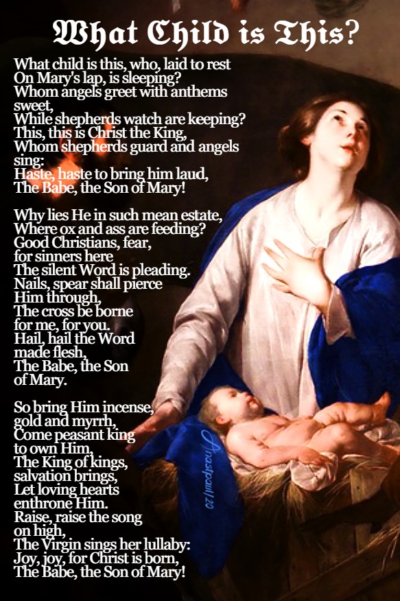 What child is this, who, laid to rest On Mary’s lap, is sleeping? Whom angels greet with anthems sweet, While shepherds watch are keeping? This, this is Christ the King, Whom shepherds guard and angels sing: Haste, haste to bring him laud, The Babe, the Son of Mary!