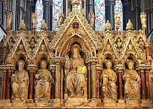 Detail inside the current Worcester Cathedral, statues around Christ the King, seated in niches, one larger and more imposing than the others, which is thought to be St Egwin.