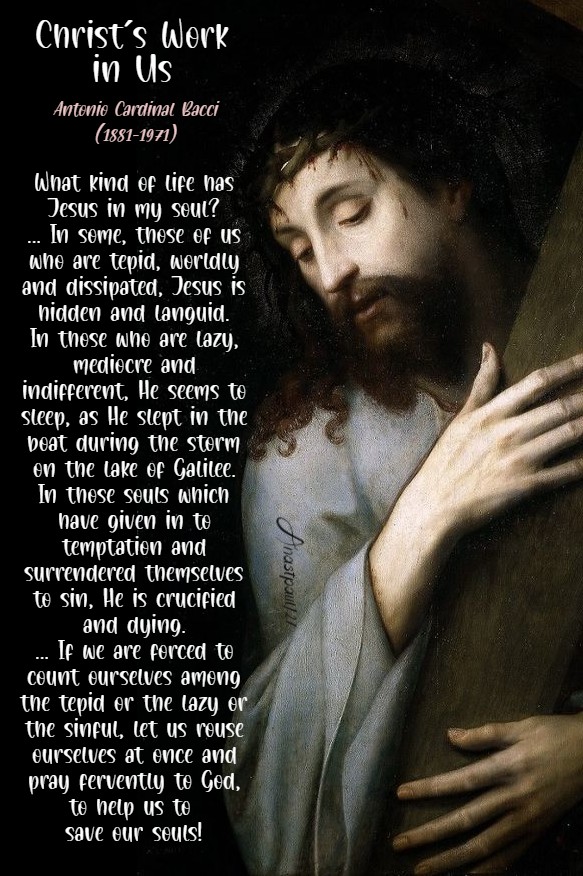“What kind of life has Jesus in my soul? If I am in the state of grace, He lives in my soul but, how does He live? In some, those of us who are tepid, worldly and dissipated, Jesus is hidden and languid. In those who are lazy, mediocre and indifferent, He seems to sleep, as He slept in the boat during the storm on the lake of Galilee. In those souls which have given in to temptation and surrendered themselves to sin, He is crucified and dying.