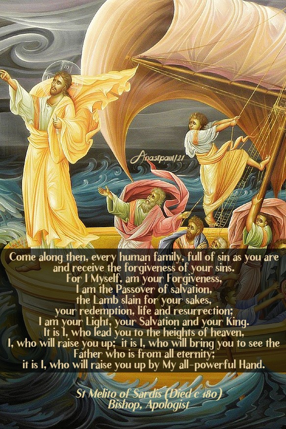 “Come along then, every human family, full of sin as you are and receive the forgiveness of your sins. For I Myself, am your Forgiveness, I am the Passover of salvation, the Lamb slain for your sakes, your redemption, life and resurrection; I am your Light, your Salvation and your King. It is I, who lead you to the heights of heaven, I, who will raise you up; it is I, who will bring you to see the Father who is from all eternity; it is I, who will raise you up by My all-powerful Hand.”