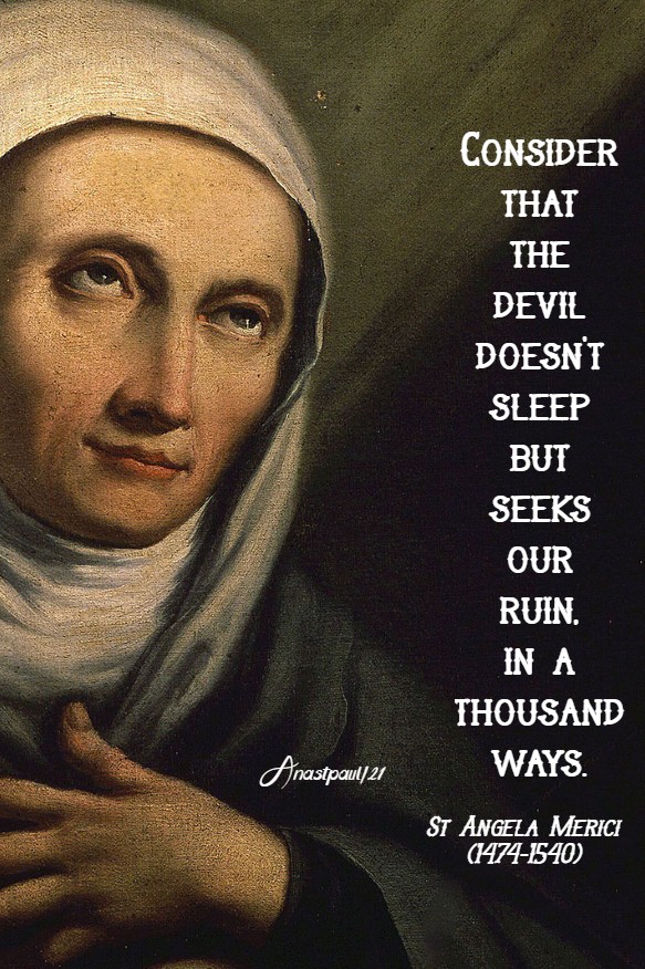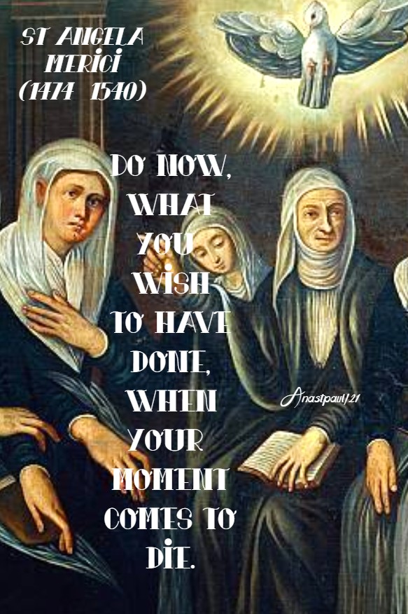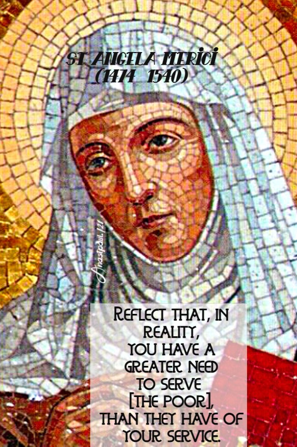 About this time God harkened to the earnest desire of the penitent – her mother died, then her husband and soon afterwards, all her children. These tragic events were very painful to her but she made the sacrifice with resignation to the will of God. Being freed from these ties, she dispossessed herself of all her temporal goods with the consent of her confessor, a Franciscan friar named Arnoldo, so that being poor herself, she might walk in the footsteps of her poor Saviour. It was to Arnoldo that she dictated her account of her conversion, now known as the ‘Memoriale,’ or the ‘Book of Visions and Instructions.’ She also entered the Third Order of St Francis and presently found herself the superior and guide of other,s who followed in her path. Many women joined her, even to the point of taking the three vows. She encouraged them in works of charity, in nursing the sick and in going personally from door to door to beg for the needs of the poor. Meanwhile, Angela became still more immersed in the contemplation of the Passion of Christ and she chose the Sorrowful Mother and the faithful disciple John as her patrons. The sight of the wounds which her Lord suffered for her sins, urged her to the practice of still greater austerities. Once Our Lord showed her that His Heart is a safe refuge in all the storms of life. She was soon to be in need of such a refuge. God permitted her to be afflicted with severe temptations. The most horrible and loathsome representations distressed her soul. The fire of concupiscence raged so furiously that she said: “I would rather have beheld myself surrounded with flames and permitted myself to be continually roasted, than to endure such things.” Still, she called out to God, “Glory be to Thee, O Lord! Thy cross is my resting place.” These painful trials lasted over two years but then, the purified and tried servant of the Lord, was filled with great consolation. She obtained a marvellous insight into divine things and was very frequently found in ecstasy. For a time she had the stigmata and for many years Holy Communion was her only food, until at last, completely purified, she entered into the eternal joy of the Supreme Good on 4 January 1310. Pope Innocent XII approved the continual devotion paid to her at her tomb in Foligno, where many miracles were attributed to her. He Beatified her in 1693. Her Canonisation was an equipollent Canonisation in 2013. Blessed Angela of Foligno said, “To know oneself and to know God, that is the perfection of man; without this knowledge, visions and the greatest gifts are of no account.” St Angela’s Biography here: https://anastpaul.com/2020/01/04/saint-of-the-day-4-january-saint-angela-of-foligno-tosf-1248-1309/