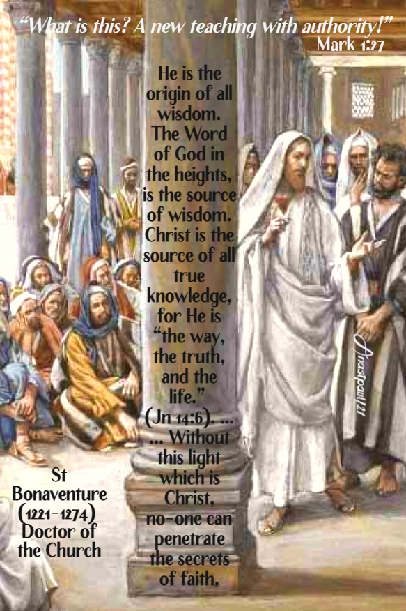 He comes first in the spirit as the revealing light of every prophetic vision. According to Daniel: “He reveals deep and hidden things and knows what is in the darkness, for the light dwells with him.” (2:22) This is the light of divine wisdom, which is in Christ. According to John, Christ said: “I am the light of the world. No follower of mine shall ever walk in darkness” (8:12) and “While you have the light, keep faith in the light, thus you will become children of light.” (12:36). … Without this light which is Christ, no-one can penetrate the secrets of faith. And that is why we read in the Book of Wisdom: “O God, send forth that Wisdom from your holy heavens and from your glorious throne, dispatch her that she may be with me and work with me, that I may know what is your pleasure … For what man knows God’s counsel, or who can conceive what the Lord intends?” (9:10-13) No-one can come to the certainty of revealed faith, except through Christ’s coming in the spirit and the flesh.” – St Bonaventure (1221-1274) Doctor of the Church – Sermon ‘Christus unus omnium magister’