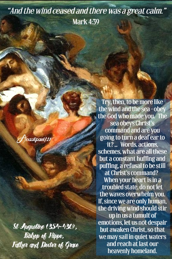 If, since we are only human, the driving wind should stir up in us a tumult of emotions, let us not despair but awaken Christ, so that we may sail in quiet waters and reach at last our heavenly homeland.” – St Augustine (354-430), Bishop of Hippo, Father and Doctor of Grace – Sermon 63